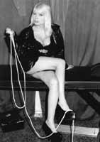 Těžko se dá přehlédnout, že spousta klientů si potrpí na oblečení. "Guma, latex, kůže, igelit, gumolatex," předvádí Sandra svoji výbavu. "Ve většině případů jsou šité na míru, protože mám nekonfekční postavu. Oblečky, jaké mám já, ty se myslím nenajdou nikde. Někteří klienti jsou dost kritičtí, skuteční perfekcionisté s dokonalým přehledem o tom, co která z nás nabízí - a ti tvrdí, že v oboru jsem na tom vůbec nejlíp. Málokde třeba můžou uspokojit zákazníka, který chce gumu nejen pro mě, ale i pro sebe. Impozantní je i sbírka pečlivě vyčištěných bot, od lodiček na nestvůrně vysokém podpatku po kozačky do půli stehen. "Ty si necháváte šít na míru?" "Ne, boty se dneska naštěstí dají sehnat ve všech možných druzích. Taky jich mám asi šedesát párů."