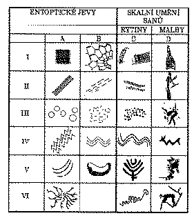 Jsou tak vnímány dva odlišné typy představ, geometrické entoptické obrazce pocházející z universální funkce lidské nervové soustavy (prvky ovládané neurologickou cestou) a halucinační symbolika s původem v mysli jednotlivce nebo v jeho kultuře (psychologické a kulturní prvky). Autoři dále pokračují analýzou dvou etnografických příkladů jeskynního umění ve snaze rozpoznat tento neuropsychologický model na základě antropologických důkazů. Pro nás je důležité si povšimnout, že obě studovaná kulturní společenství (křováci Sanové, žijící v poušti Kalahari, a šošonský kmen Koso z území Velké kalifornské kotliny) zřejmě k vyvolávání vizí užívají omamných látek. V obou případech se zdá, že zanechali viditelný záznam ze svých spirituálních cest v podobě jeskynního umění. Obrázek dokazuje, že entoptické obrazce sehrály svou úlohu v obou případech jeskynního umění kultur Sanů i Koso, a tato skutečnost přivádí autory k hypotéze, že srovnatelné geometrické znaky pozdního paleolitického umění jsou ve skutečnosti entoptickými obrazy vzniklé v pozměněném stavu vědomí. Různé způsoby vzniku entoptických jevů zmíněné už dříve (otupení smyslů, vyčerpání, nemoci atp.) mají paralelu v šamanských výpravách za vidinami. Mircea Eliade ve své slavné monografii o šamanismu vyjmenovává celou řadu různých stavů, jež usnadňují spirituální výpravy. Mezi nimi se nacházejí fyzické choroby, dočasné nervové poruchy, tanec a bubnování až do úplného vyčerpání a rituální osamocení v jeskynních nebo jiných opuštěných místech. Lewis-Williams a Dowson usuzují, že jeskyně západní Evropy vyzdobené malbami, jež neplnily každodenní úlohu v pravěkém životě a do nichž byl obtížný přístup, by poskytovaly ideální místo pro iniciační a šamanské vize.
